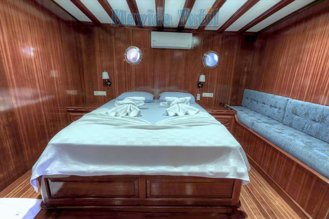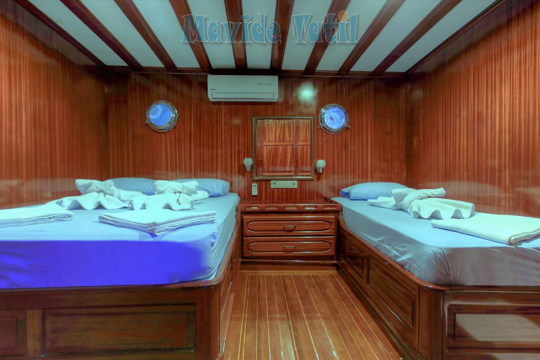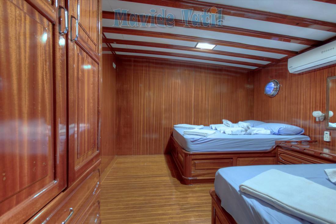 6 double, 2 triple kamaranın tamamında duş, tuvalet, saç kurutma makinesi ve 1 haftalık ihtiyacı karşılayacak kapasitede dolaplara sahiptir.