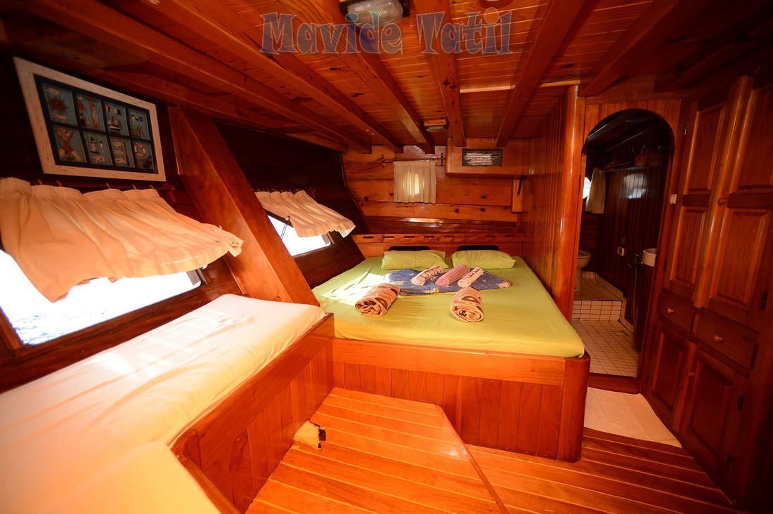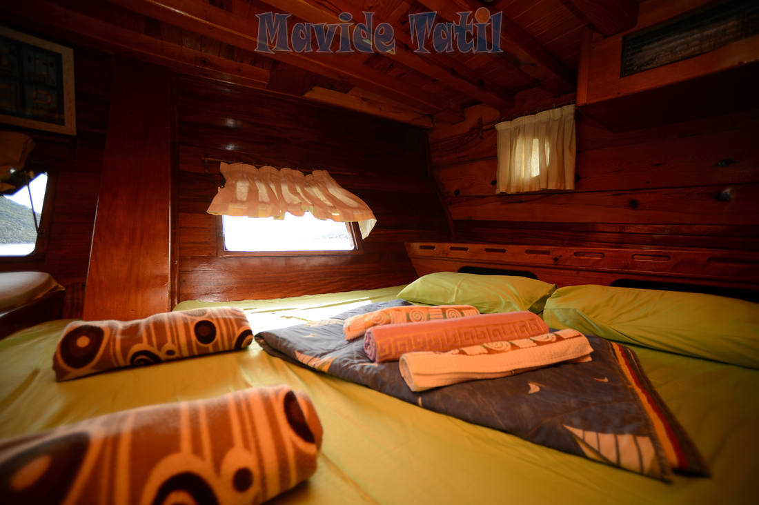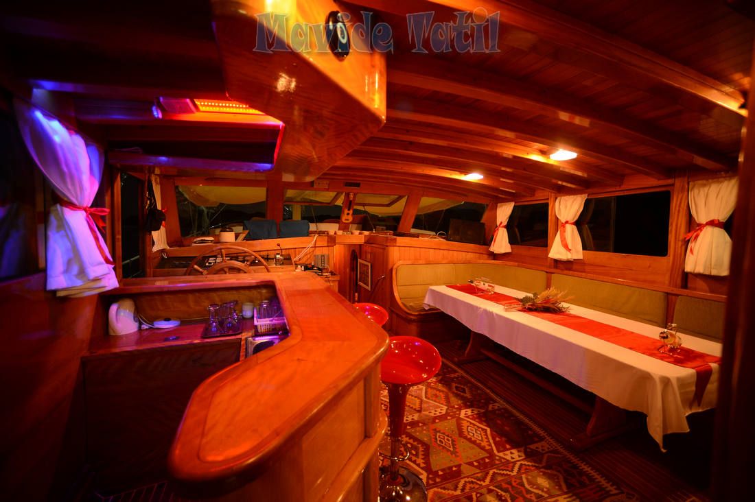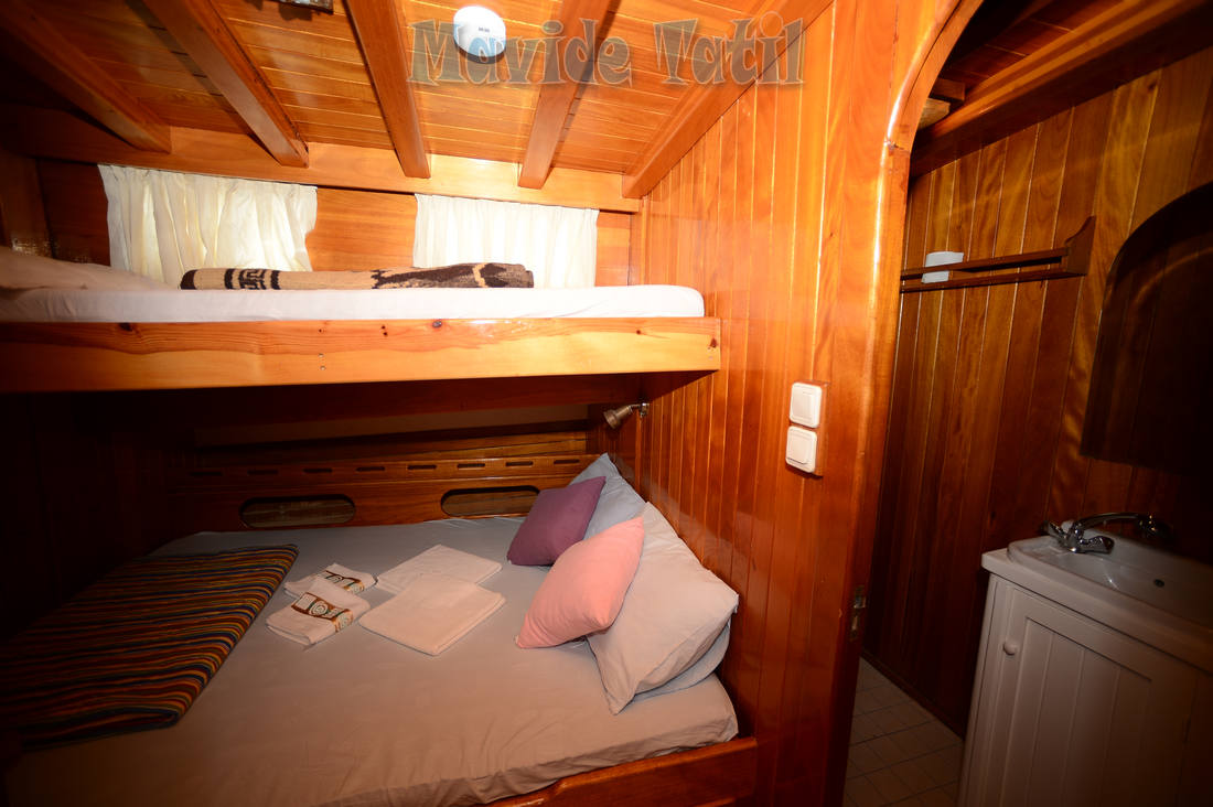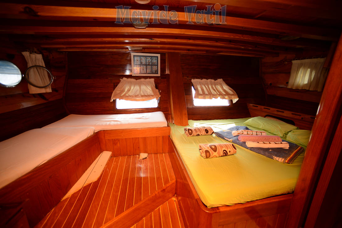 24 metre, 7 kamaralı teknemiz, 6 double, 1 master kamarasıyla 14 kişiye kadar hizmet verebilmektedir. Bütün kamaraları klimalı, duş ve tuvaletlidir.